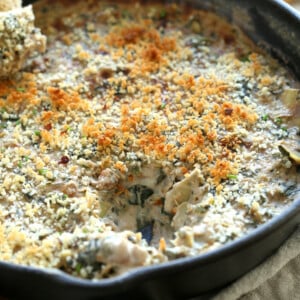 Easy 1 Pot Vegan Spinach Artichoke Dip Recipe. Ready in 30 Minutes. This Creamy Cheesy artichoke dip is perfect for parties, picnics, game day. No Cream cheese or vegan cheese subs. Can be glutenfree, nutfree. Use a 9 inch skillet or stoneware dish to bake