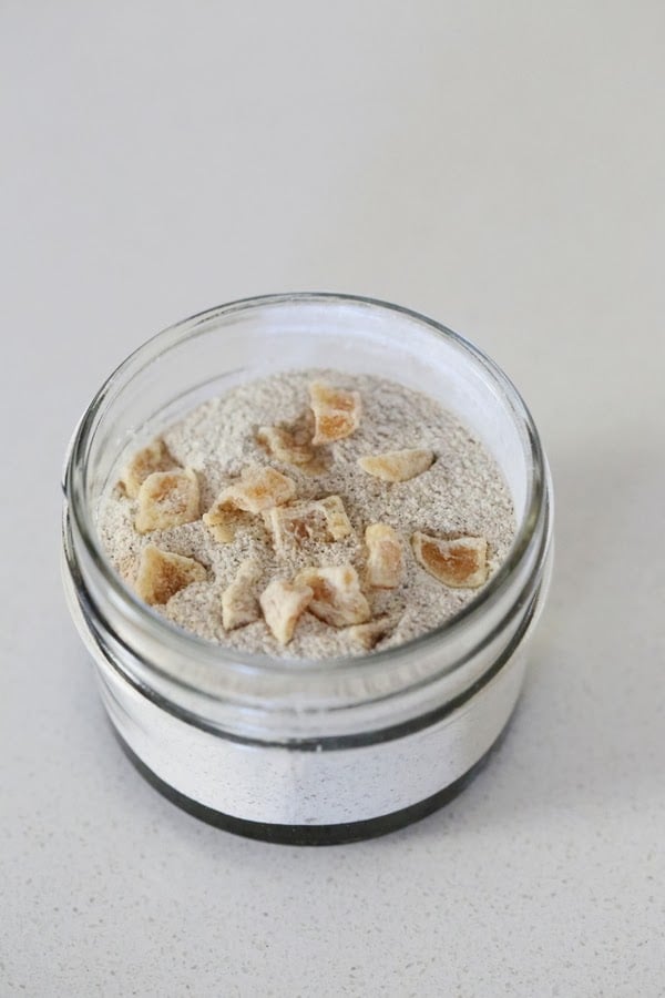 Drop the molasses into the jar and spread at the bottom. In a bowl, mix all the flours and the other dry ingredients. Add to the jar. add some candied ginger. Close the lid and keep ready.