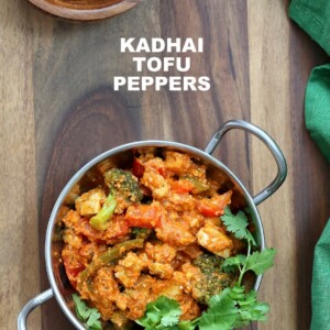Kadai Paneer Tofu & Peppers. Kadhai Tofu in spiced tomato sauce. Shimla Mirch/ Capsicum, Broccoli and Crisped Hemp Tofu in an easy blender tomato almond sauce make a great Kadai “Paneer” entree for Diwali. Vegan Gluten-free Soy-free Cashew-free Indian Recipe.