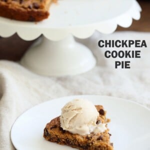 This cookie pie is fudgy, chocolatey, crispy on the edges, gooey in the middle and just perfect all around. There is no flavor of the chickpeas. Serve these with your favorite vegan ice cream or as is. I like to make the pie skinnier than a deep dish cookie pie to allow it to crisp and cook evenly and be more cookie like. Other beans such as white beans or navy beans should work as well. This recipe is gluten-free and can be made nut-free.