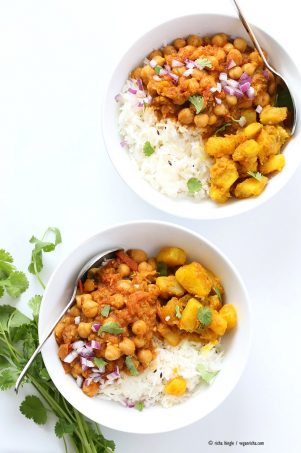 - Chana Masala Bowl with 5 min spiced potatoes. Coz chickpea curry and potatoes! GF SF NF