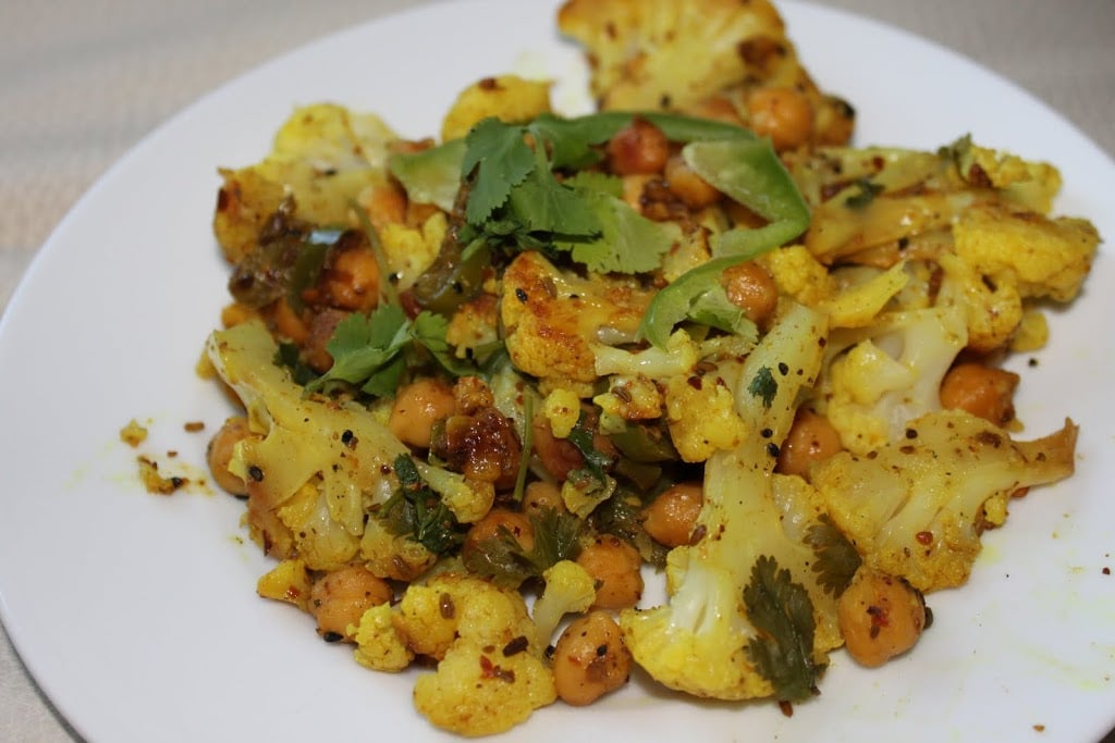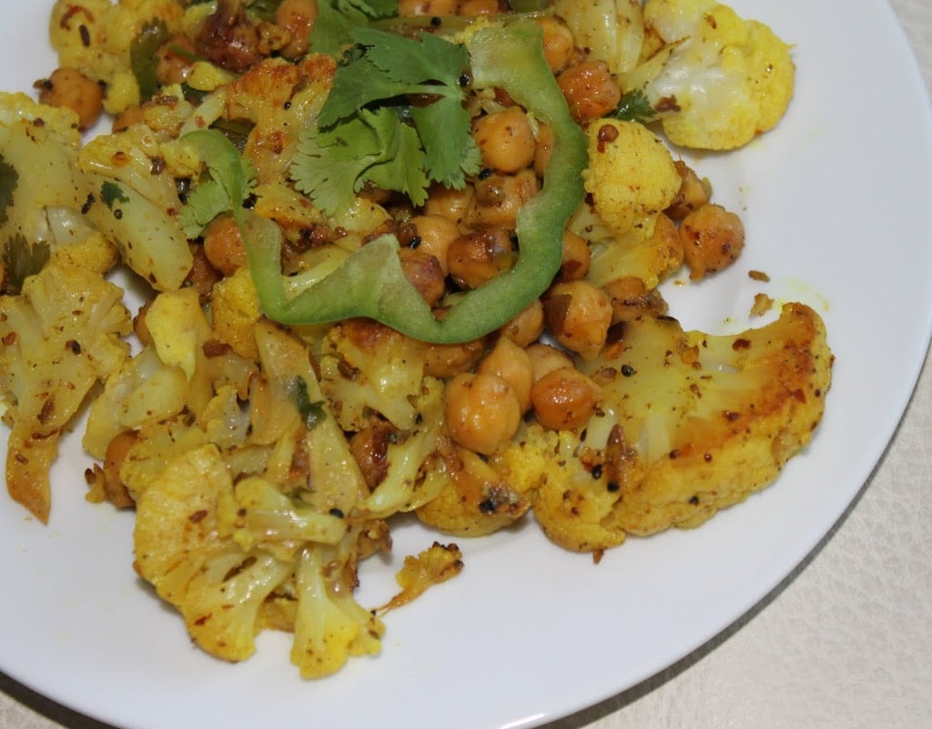 Achari Gobi (pickled cauliflower with garbanzo beans and bell peppers). A delicious, easy and healthy meal great for weeknights. Vegan and Gluten Free Recipe. Jump to Recipe