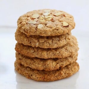 These vegan almond butter oatmeal breakfast cookies were sitting in my drafts since a month. I saw it yesterday and decided to edit the pictures to post. This is one very satisfying cookie. It is chewy, not too sweet, filled with tons of oats, delicious, and has no added refined oil! You can use any other nut butter like peanut, cashew, hazelnut or use seed butters to make these as well. Top the cookies with almond slivers or seeds and keep some handy for snacking. If you have not figured it out yet, I like almond butter more than PB 🙂