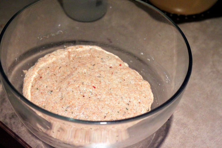 Ricki’s Almond feta recipe variation: I added parsley and thyme for this pizza. I used raw almonds instead of blanched and soaked them overnight. Peeled some of them and left some unpeeled, hence the brown flakes in my cheese. The rest of the recipe is the same.