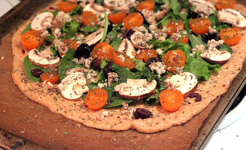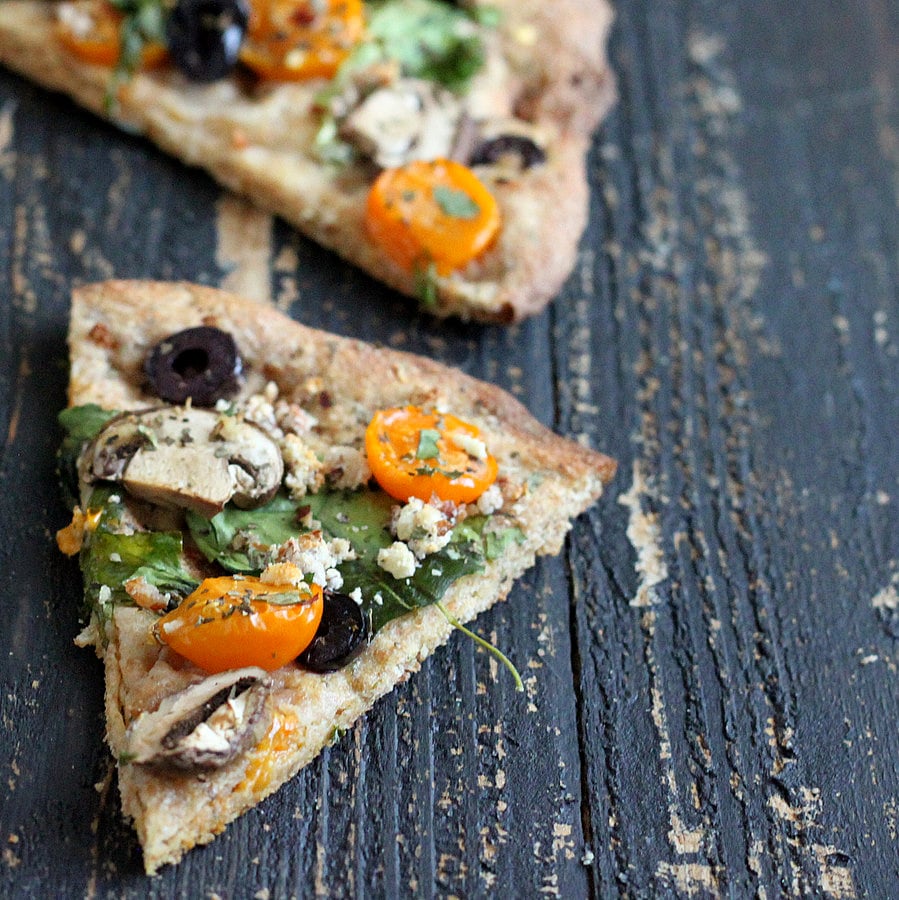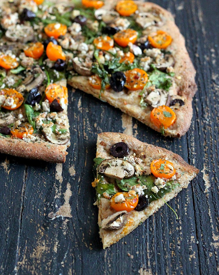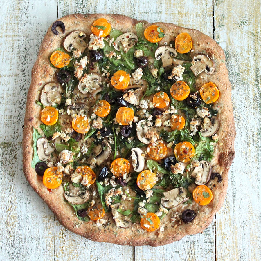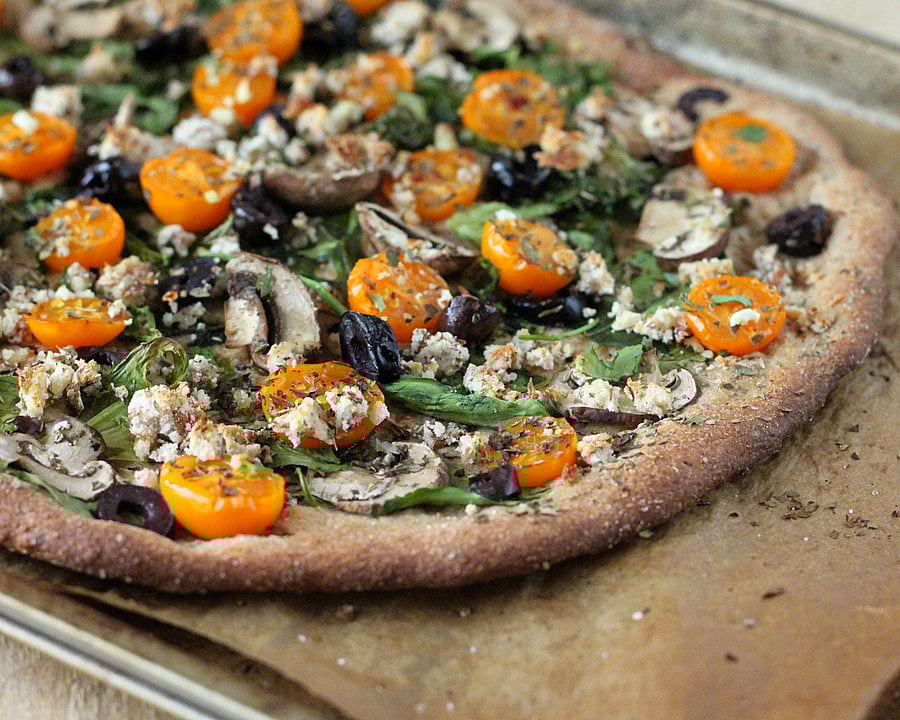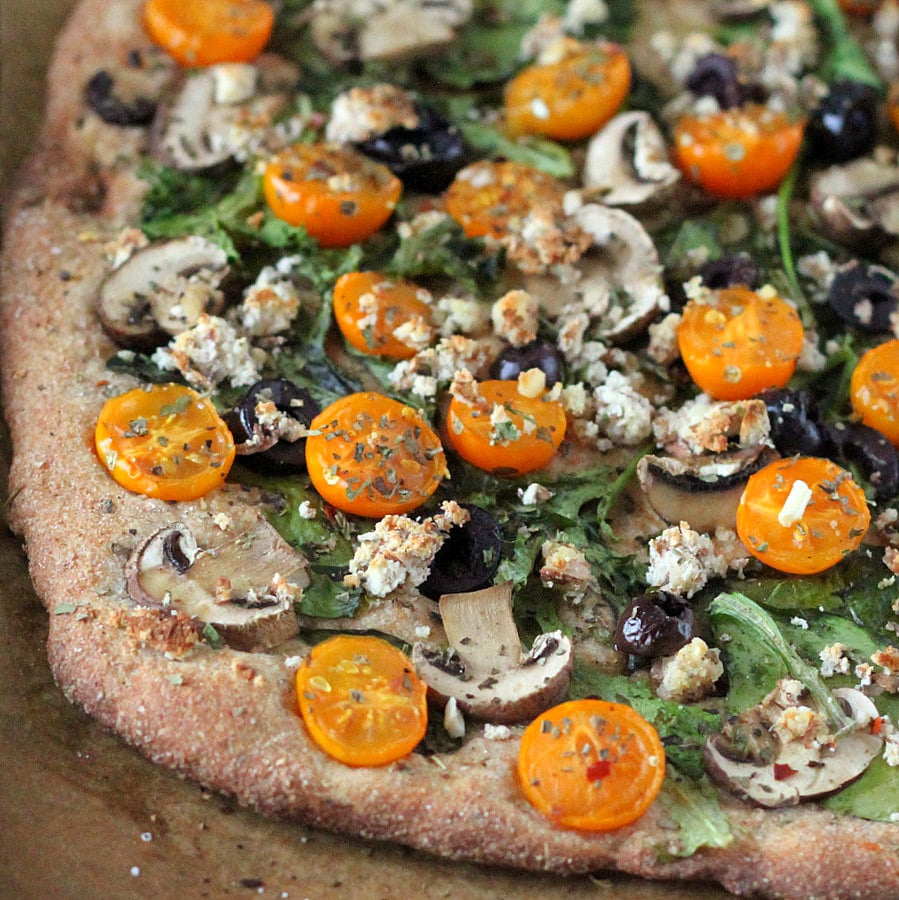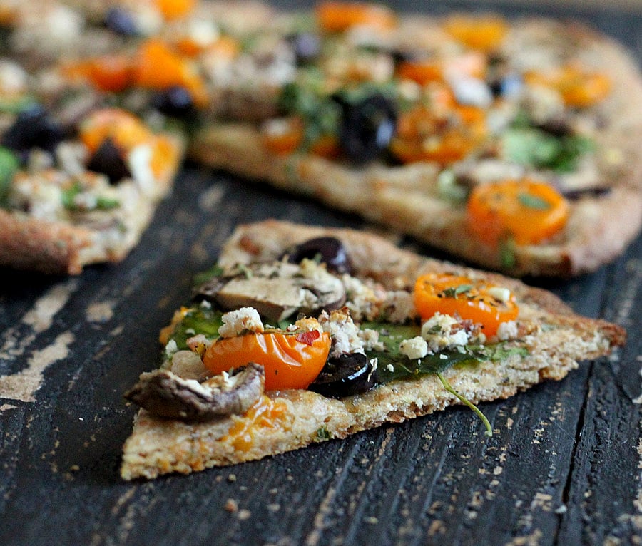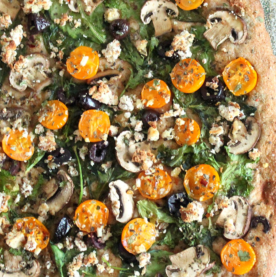 Almond Feta, Mushroom, greens, olives, golden cherry tomatoes. Vegan Mediterranean Pizza with Thin Herbed Spelt Crust. vegan recipe