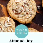 Vegan Almond Joy Cookies – these are perfect for the holidays! 1 Bowl Crisp almond flour and coconut cookies with hidden chocolate in the middle, topped with almond slivers! 1 Bowl , no big appliances or whipping up butter and sugar! Gluten-free grainfree