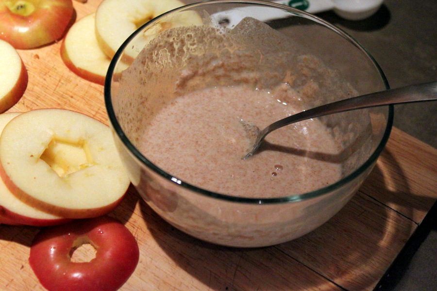 Dip apple slices in the batter and fry them on medium heat 2-3 minutes each side until golden brown. (Add in a few teaspoons more water if the batter is too thick.)