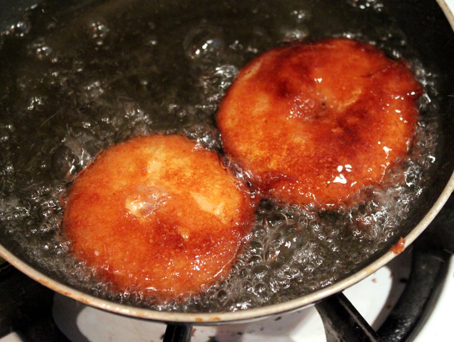 Remove from oil, drain on a paper towel and place the fritters in warm sugar syrup. Flip after half a minute so the other side can soak as well. Remove from the syrup after half a minute.