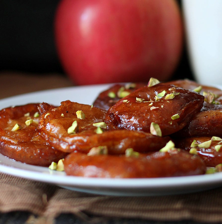 I decided to make another non laddoo sweet. Apple Jalebis! These Jalebis are served warm topped with chilled Rabri. Apple Jalebis are Apple fritters soaked in saffron(kesar) flavored sugar syrup. Apple slices are dipped in a wheat flour batter, fried and soaked for a minute in the syrup and voila, you have one delicious dessert. Use fusion flavors like cinnamon, pumpkin pie spice in the syrup instead of saffron, to match your holiday menu!