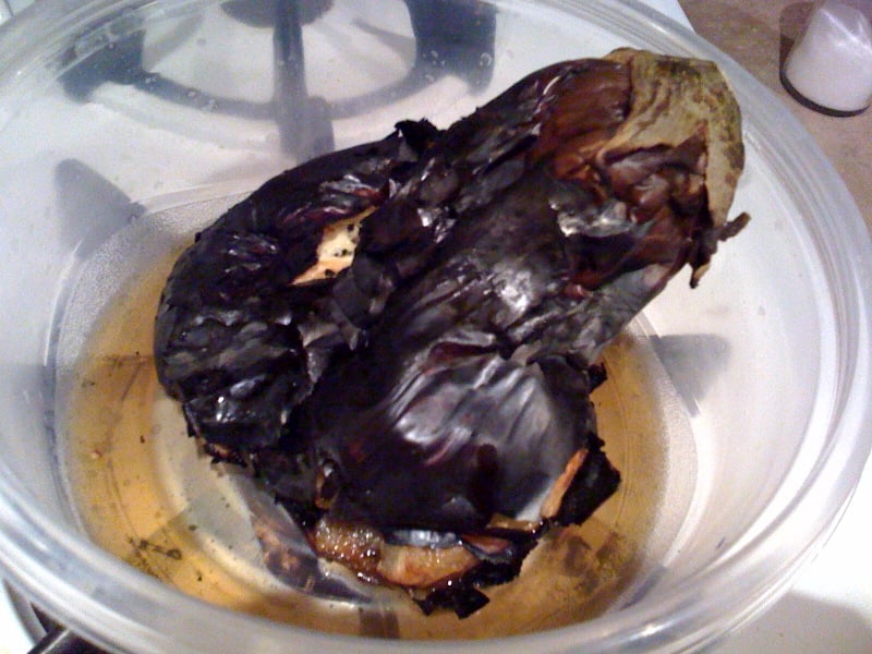 - Roast the eggplant on a medium flame gas burner for 15-20 minutes, moving it every 4-5 minutes. It should start becoming charred and mushy and look like the picture above. I dont roast the eggplant completely like my mom does, because then the gas burner becomes very messy. The eggplant starts to drip once the skin gets charred and open. I usually put a foil and some water in the burner base to help with the cleaning later. The burner top though, you cant save:). I just char the skin to get the roasted taste in the eggplant.