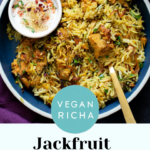 Fragrant jackfruit biryani uses spiced jackfruit instead of meat to veganize this favorite dish! Baked means less active time of standing and sautéing. Everything baked in just 1 Pan, and needs just 2 steps.