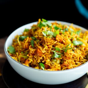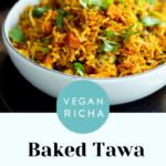 This Tawa Pulao – Spiced Rice casserole needs just 1 Pan and 1 step! Dump and done bake with veggies and warming Indian spices. Serve as a main with added chickpeas or as a side with your favorite curry. 1 step 1 pan dump and bake! Gluten-free. Nutfree soyfree