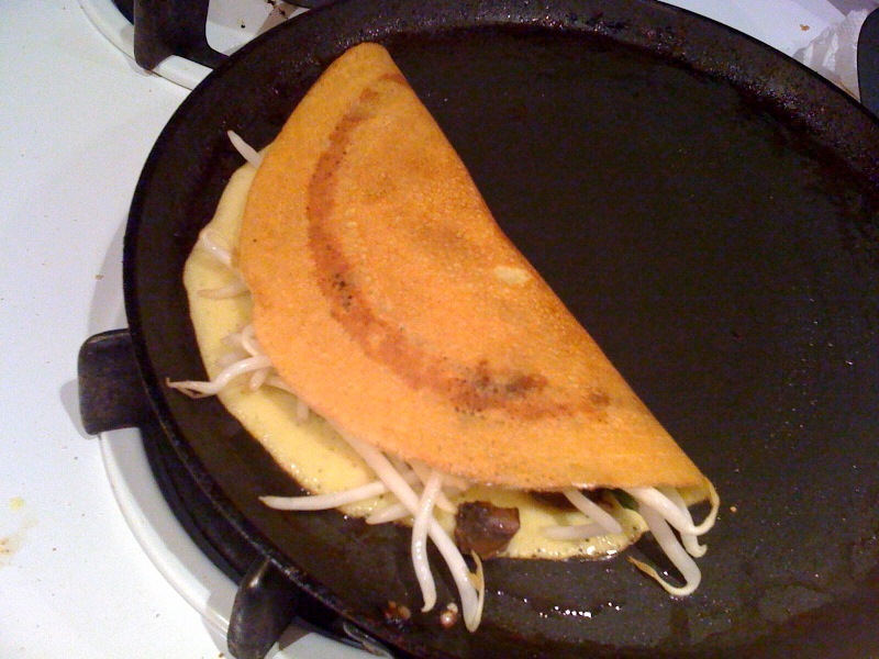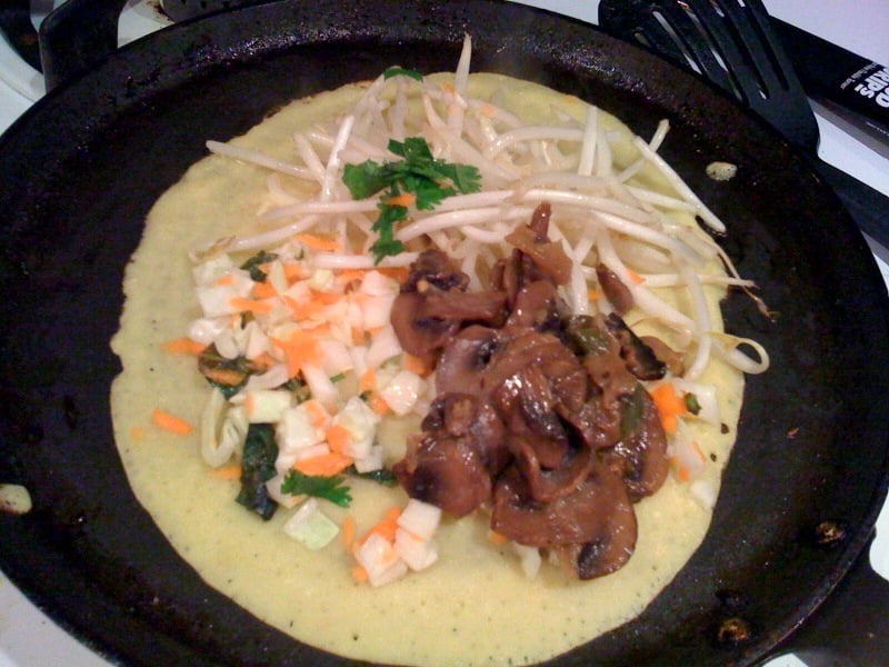- Top one side of the crepe with the filling(mushrooms or veggie or both) and top off the filling with bean sprouts and the fresh herbs(mint, basil and cilantro).
