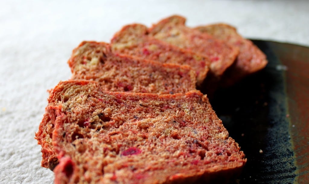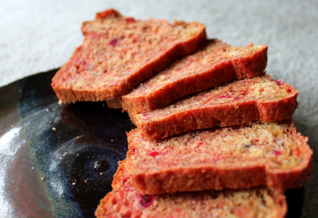 Yes, I am still in mini loaf mode.. those tiny slices get consumed quickly and let me make different breads every few days..! This one is beety carmine colored with an added slight deep blue from the blueberries.. Deep colors for this bright summer!