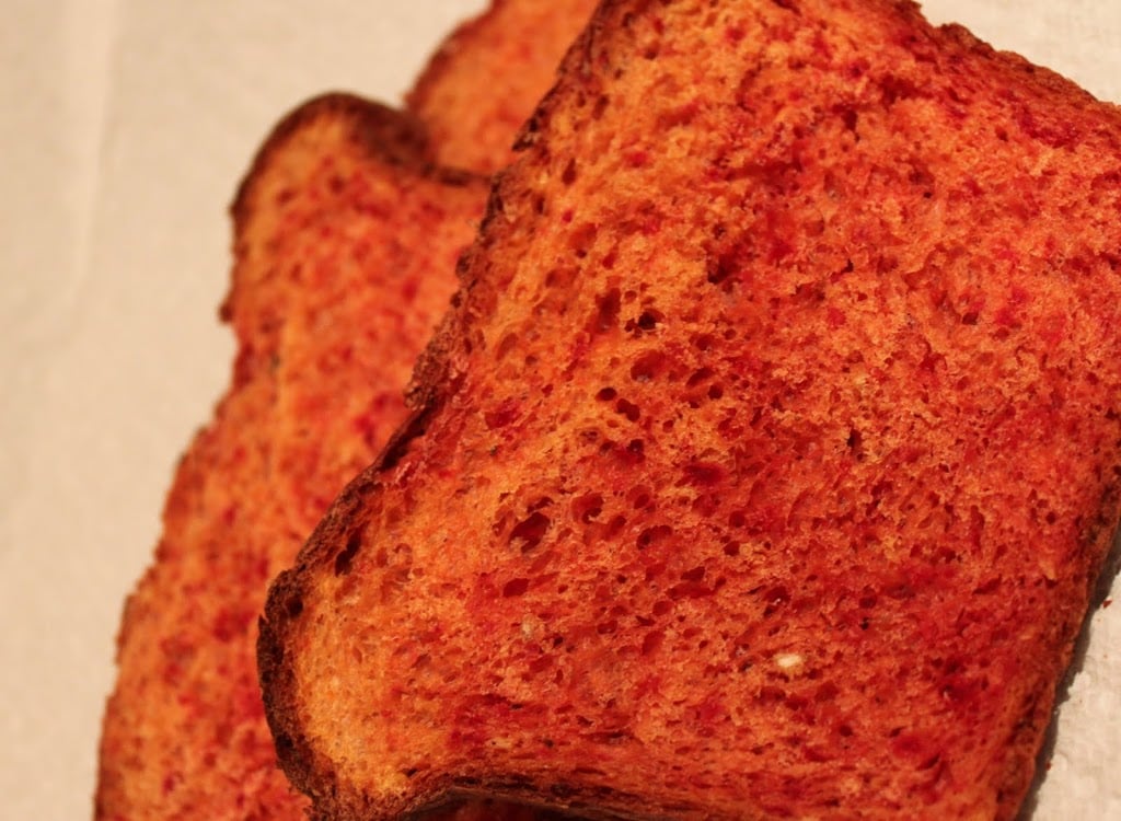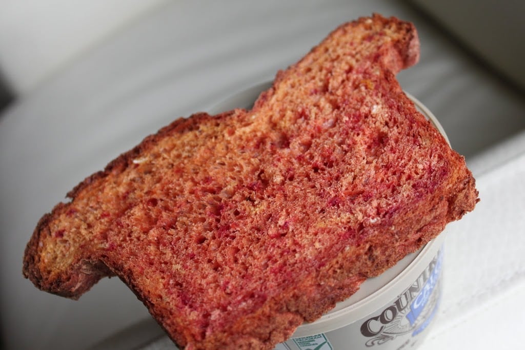- Cool completely before slicing. Since hubby was freaking out on the color of the bread, I toasted the slices to a nice brown to serve him with the breakfast! I love the color though!