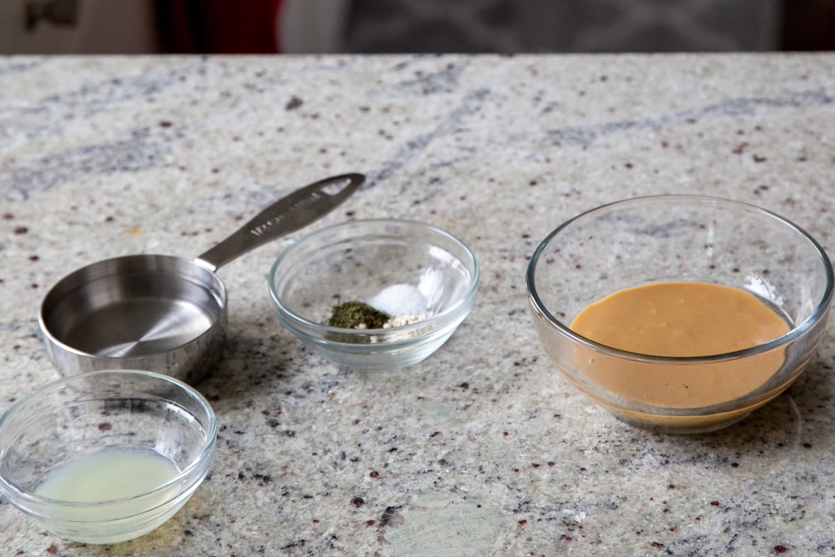Ok, we have one more dish because we make a little tahini sauce on the side to drizzle the sheet pan dinner with after cooking. While the tahini sauce is optional, it is totally recommended because the creaminess of the tahini really lifts the whole dinner to a completely new level of delish.