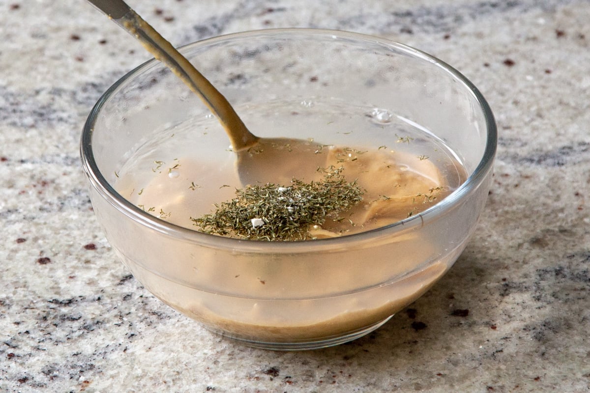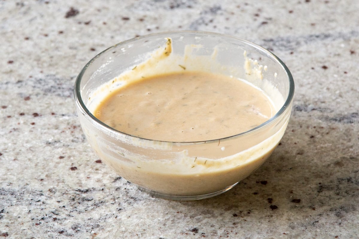 - Meanwhile make the tahini dressing. Add the tahini, 2 tablespoons of water, lemon juice, dried dill, salt and garlic powder to a bowl. Mix really well. Add more water as needed to make a creamy thick dressing. Taste and adjust salt, tang and flavor.