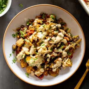 Once the veggies are done cooking, remove from the oven and plate them in your serving bowls and drizzle with the tahini dressing.