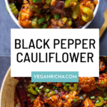 This easy recipe for Black Pepper Cauliflower is a vegan spin on black pepper chicken. Bake the cauliflower, make the sweet and spicy pepper sauce, combine and your meal is ready. Nut-free & glutenfree!