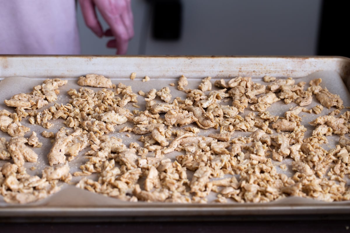 Transfer the soy curls to parchment paper or baking sheet and bake at 400F (205C) for 15-20 minutes or until crisp to preference.