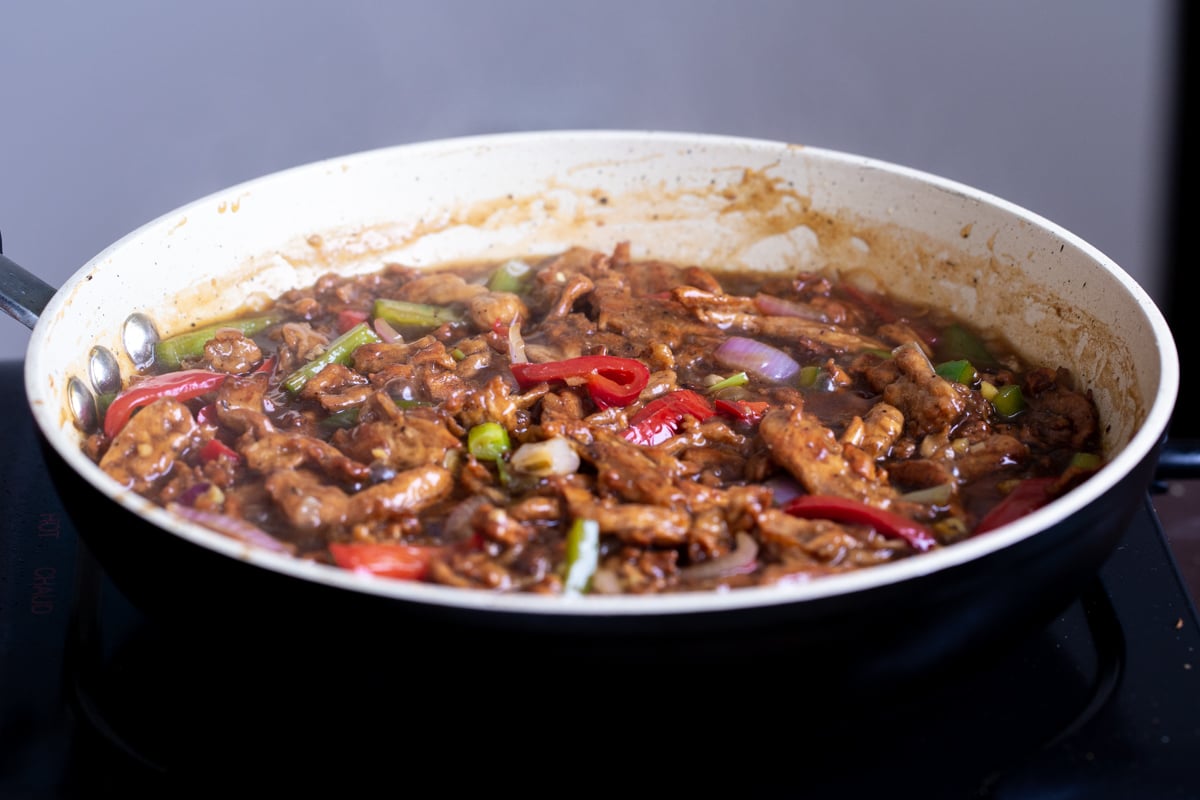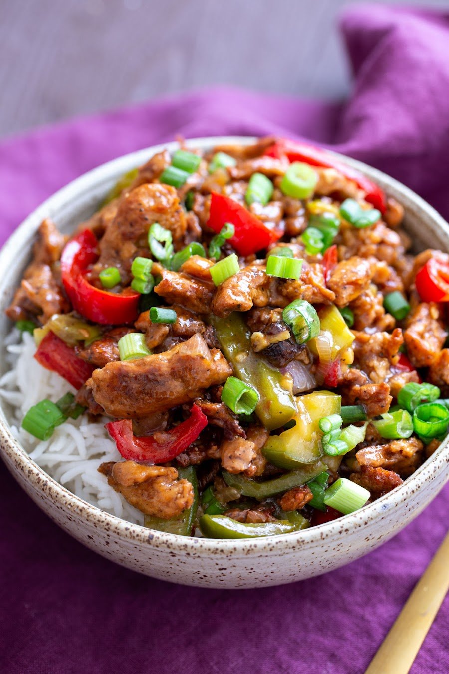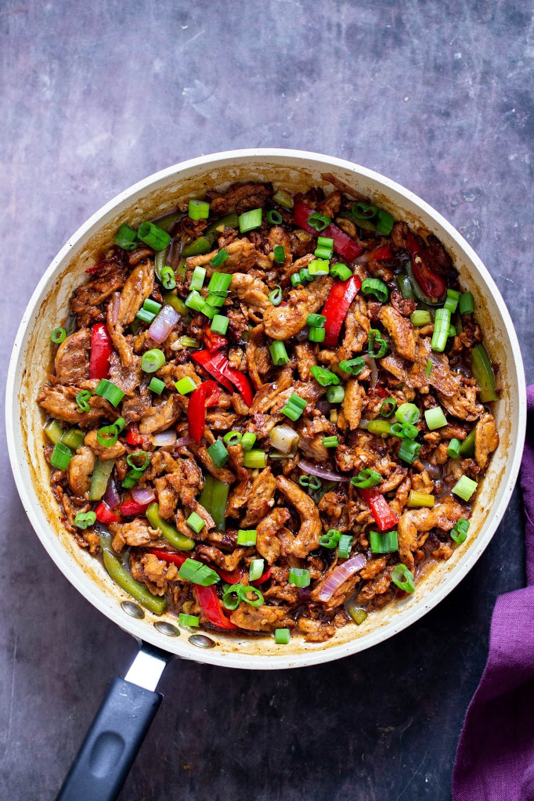 I used to love black pepper chicken or Sichuan pepper chicken in Chinese and inspired restaurants. It usually is a popular favorite amongst many—so I thought why not test out my own vegan-friendly inspiration with soy curls? Soy curls are a great food staple for vegetarians and vegans because they are protein-based and you can do so much with them. Spice it up or marinade them, bake them, pan fry them, shred them, crisp them.
