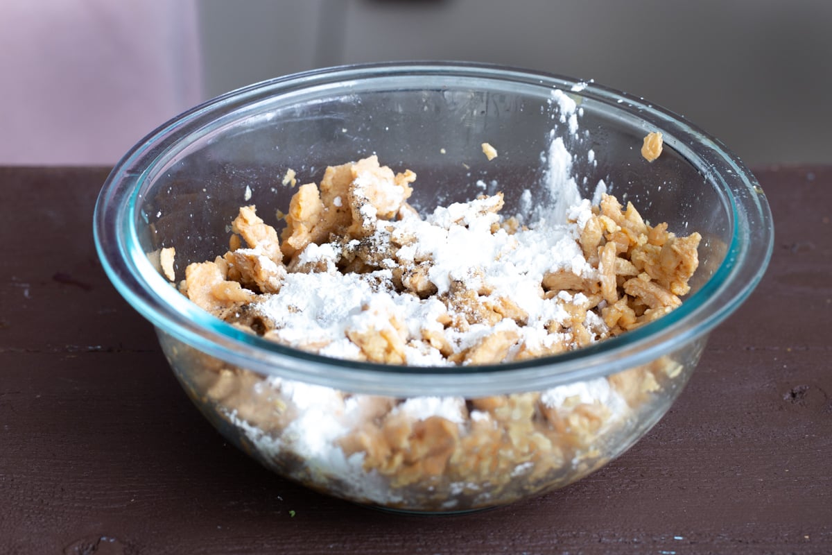 Add the soy sauce to the soy curls and toss well. Then add the cornstarch mixture to coat.