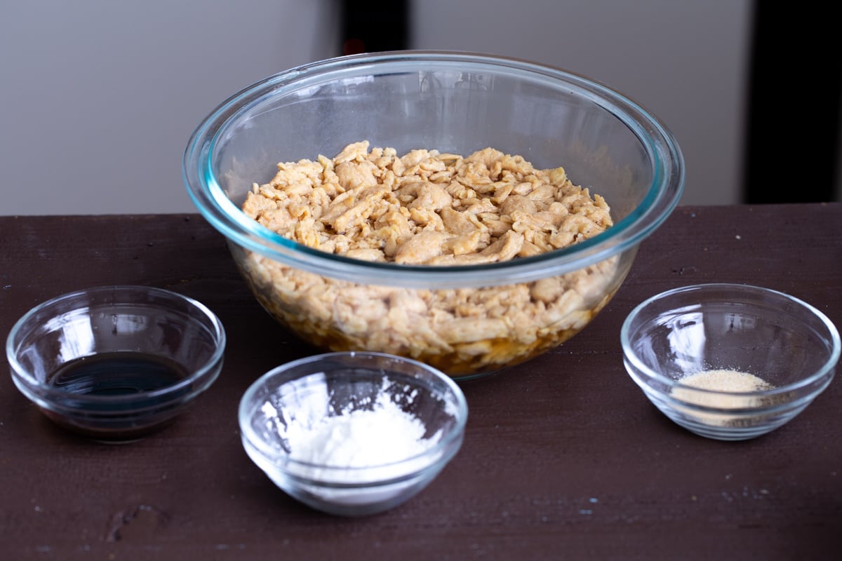 Once they are done soaking, drain the soy curls. Reserve the soaking water and press the soy curls a little bit so that there is not too much excess moisture. Transfer the soy curls to a bowl.