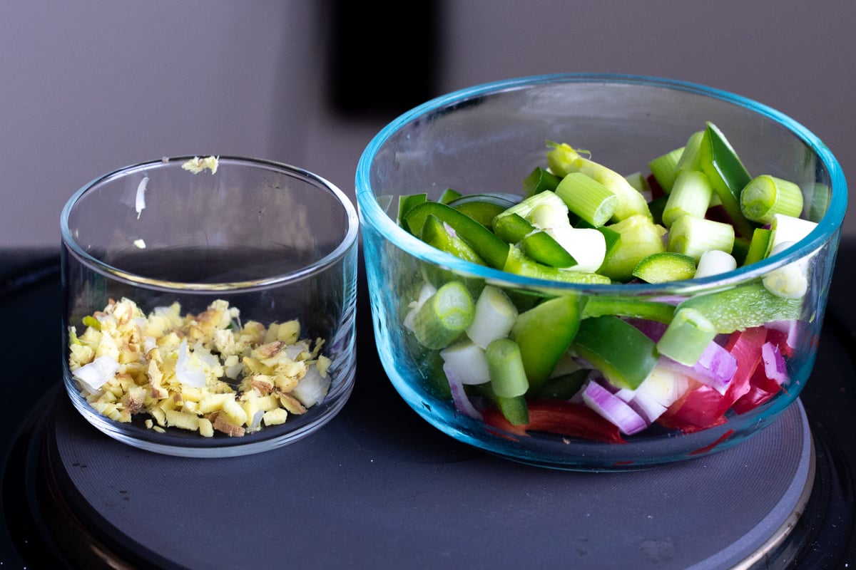 - For the vegetables: sesame oil ,Chopped green and red bell pepper, Chopped onion, chopped into ½ to 1 inch pieces, White parts of the green onion, reserve the green parts for garnish, Cloves of garlic, minced, Ginger, minced