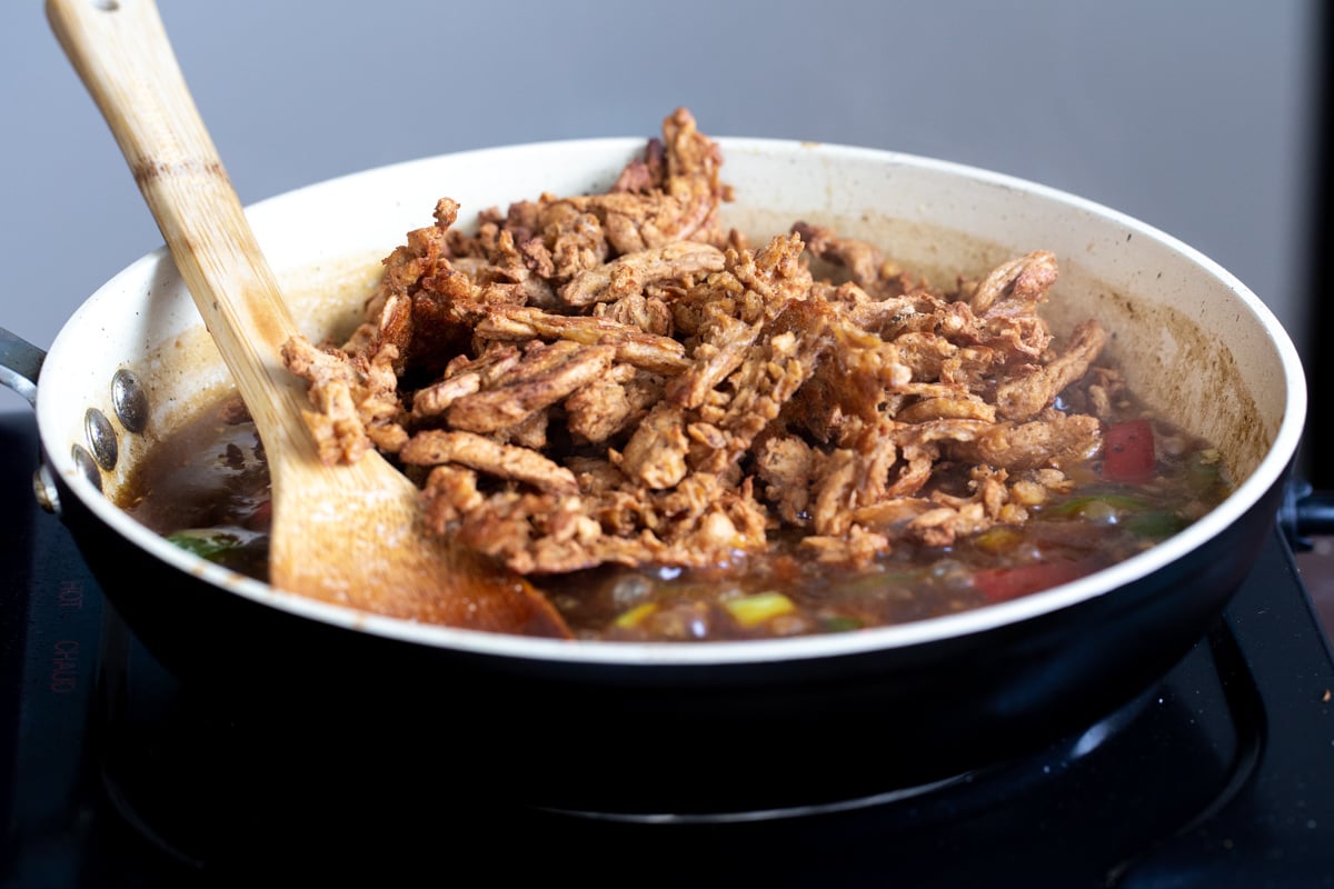 Once the sauce is thickened a little bit, add in the baked soy curls and toss well. Then take off heat.