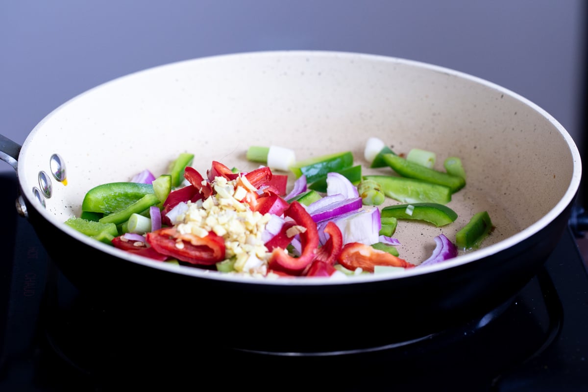- Heat the large nonstick skillet over medium heat, add oil. Once the oil is hot, add in the chopped vegetables and garlic and ginger. Add a pinch of salt, and toss well. Cook for a minute or 2, we want the vegetables to be crunchy but we also want the garlic to start to turn golden.