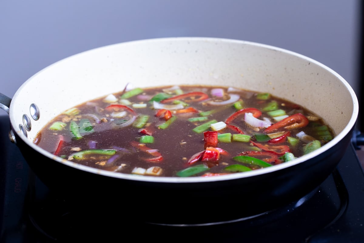 As soon as the garlic is starting to turn golden, add in the sauce mixture and mix in. Bring it to a boil and continue to cook for a minute for the sauce to thicken.