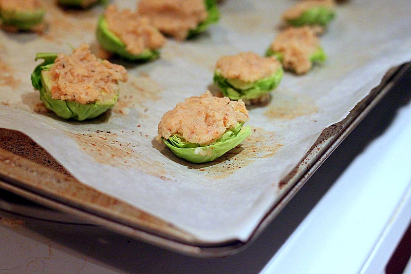 - Mix all the ingredients, except BSprouts, to get a thick pasty mix. Let sit for a minute. Then coat halved brussels sprouts with it. The mixture is not very sticky, so just press on both sides to cover as much as you can. (See ready for baking picture above) Adjust water and chickpea flour if needed.