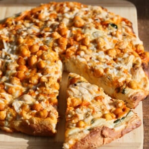 If you have the pizza dough ready, then this Pizza is a breeze to put together too. Mix up the buffalo sauce and chickpeas, make the blender sauces. Layer them all up, Bake and serve. Vegan, palm oil free and soy free! Easily gluten-free with my gf crusts. btw buffalo sauce has nothing to do with the animal Buffalo but everything to do with the location it was created at, Buffalo, NY.