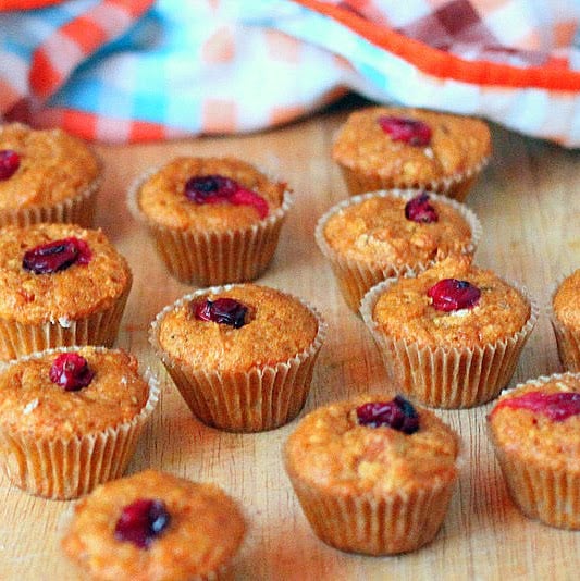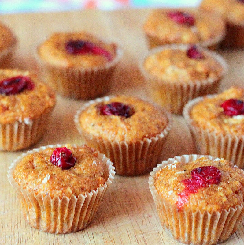 - Add in the flours and ground Oats and mix until just about combined. Drop mixture in mini muffin liners in muffin pan Or greased cake pan. Smooth the top and top the muffins with cranberries(pictured), raisins or jam.