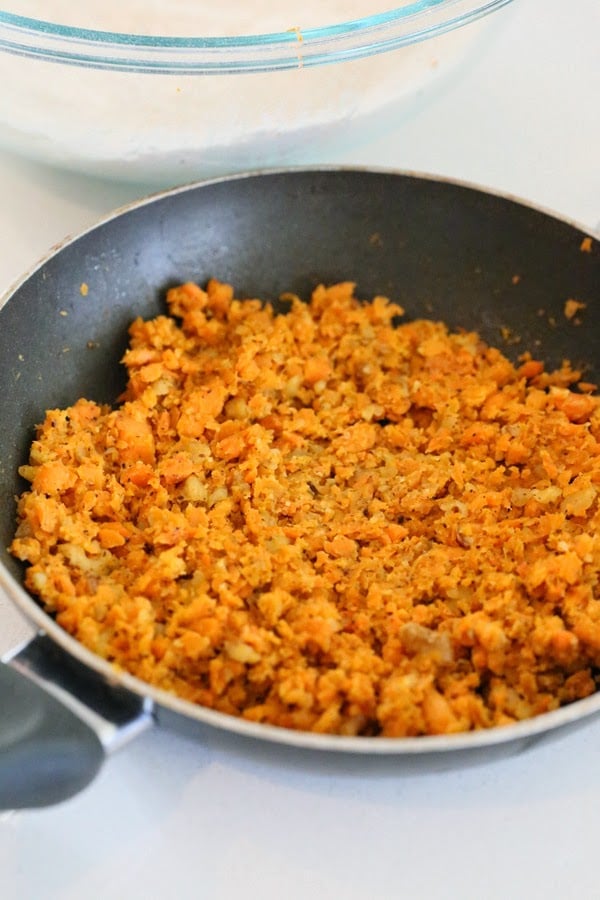 - In a pan, add oil and heat at medium. Add the carrot walnut mixture and roast for 3 minutes. Add the sugar and spices. Mix and cook for another 4 minutes. Reserve a Tbsp of the mixture to top the pancakes.