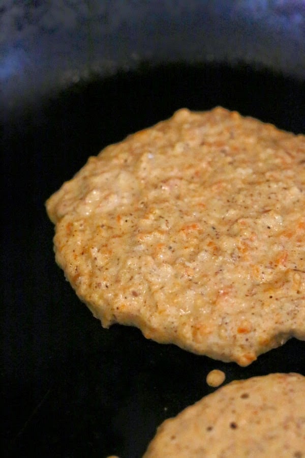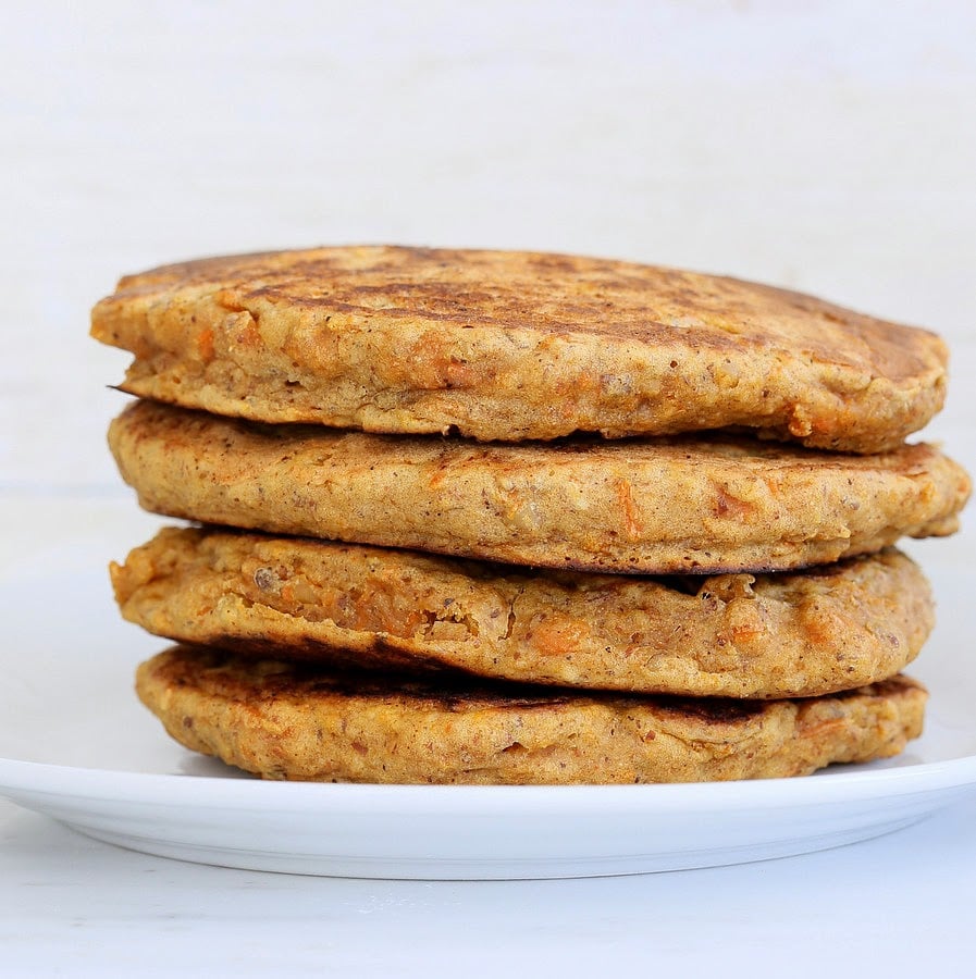 These pancakes have a good load of roasted grated carrots. I also added some walnuts to the mixture. You can use more carrots or other nuts or seeds. Make a thick batter, add the carrots and make fat pancakes. The pancakes are super delicious by themselves. Serve them up with maple syrup and a sliver of butter.