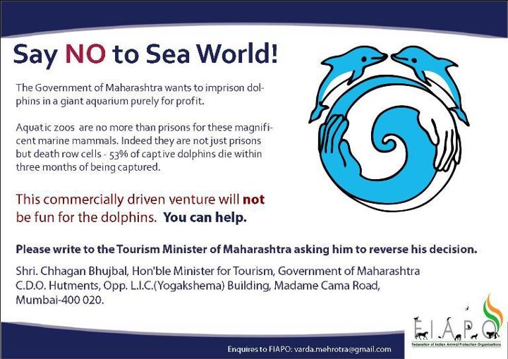 In October, 2011, the Government has approved a Rs 510 crore project to build a dolphin park, with a giant aquarium and a facility to train and keep dolphins along the Arabian Sea coastline in Sindhudurg. Such cruel dolphinariums have been criticised and banned in many countries and yet plans are in place to bring them to India.