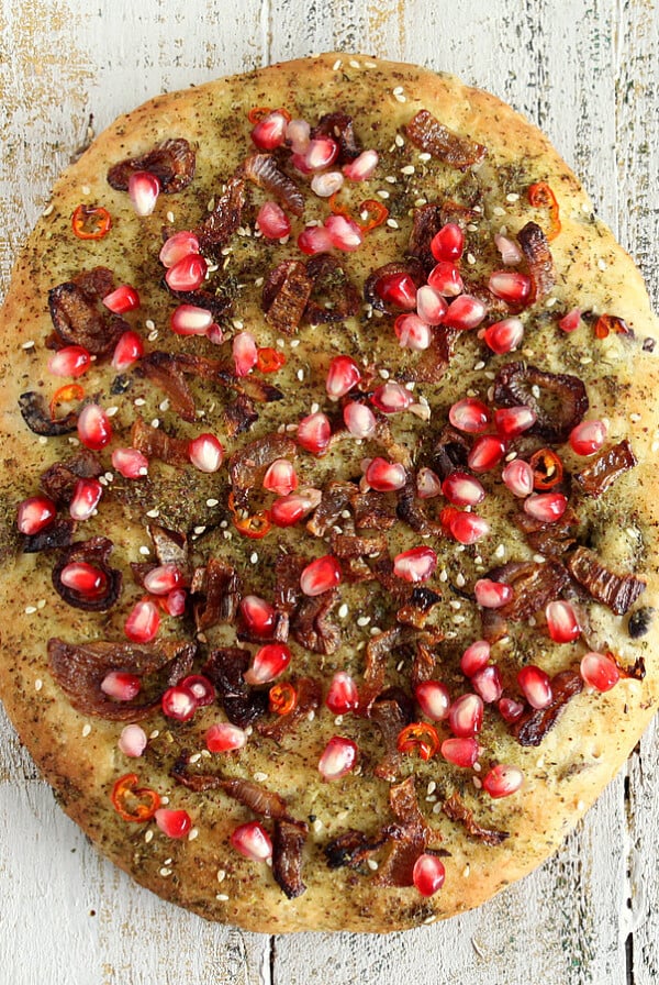 SnacksQuinoa Olive Focaccia Crust Pizza with Zaโatar, Caramelized Onions and Pomegranate. vegan recipe