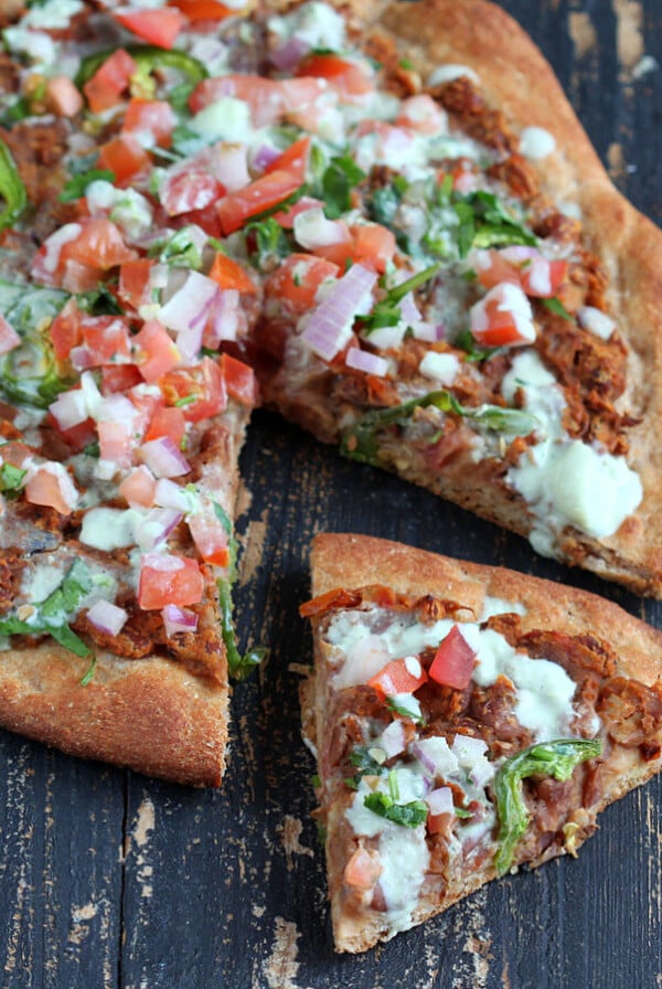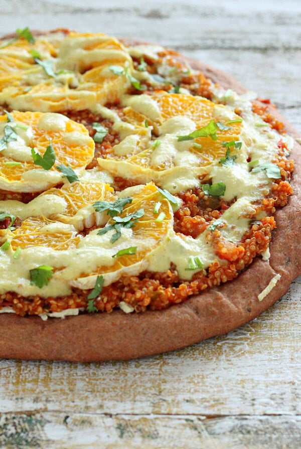 Soy FreeSFSoy FreeQuinoa Sloppy Joes Pizza with Rye Crust, Orange slices, Jalapeno Aioli. vegan recipe