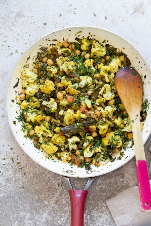 Cauliflower Spinach and Chickpeas with Mustard Seed Curry Leaf Sauce