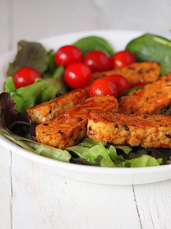 Gluten FreeGFGluten FreeMaple glazed Tempeh, cherry tomatoes and baby greens Salad. vegan, glutenfree