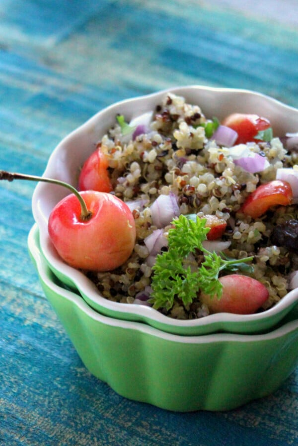 Soy FreeGFGluten FreeRORefined Oil-FreeSFSoy FreeToasted Rainbow Quinoa Salad with Rainier Cherries, Raisins, Red onion. vegan gluten-free fat-free recipe