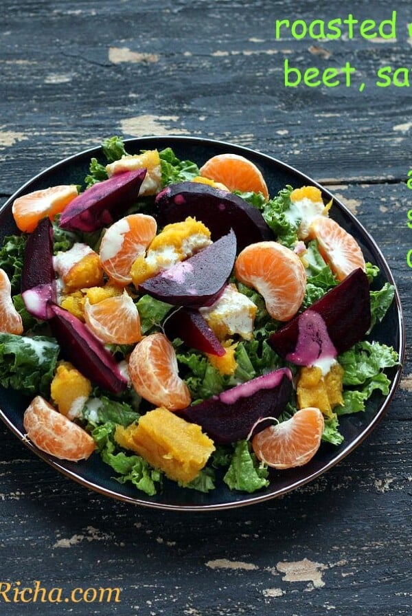 Soy FreeGFGluten FreeSFSoy FreeRoasted Acorn, Beet, Satsuma, Kale Salad with Almond Sesame dressing. Glutenfree Vegan Recipe