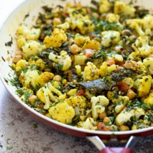 This easy cauliflower chickpea and spinach sauté features a fragrant Mustard seed & Curry Leaf Sauce – an easy vegan meal that is ready in under 45 minutes. Packed with healthy cauliflower, creamy chickpeas, and superfood spinach in every bite. Grain-free and gluten-free! Jump to Recipe