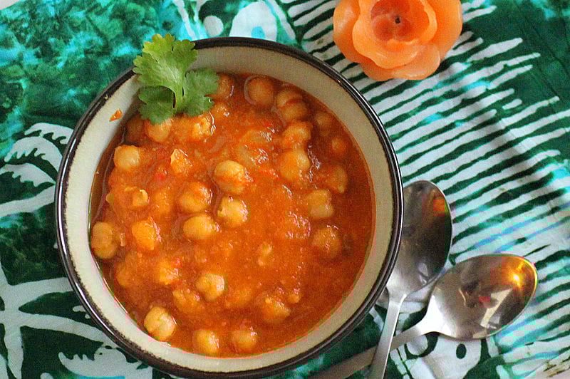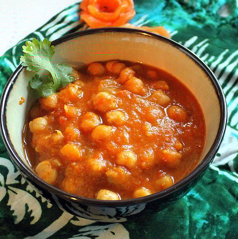 • Saucepan: Use canned or slow cooker cooked chickpeas, or dry chickpeas soaked overnight. In a deep pan, make the tomato onion mixture as above. Add the chickpeas and 2 cups of water and cook for an hour or so, covered, until the chickpeas are tender. Mash some chickpeas and let cook for another 5-10 minutes uncovered. Adjust water for preferred consistency.