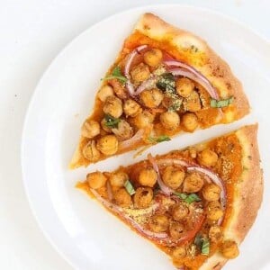 Chickpea Pumpkin Veggie Pizza with Basic Pizza crust. Pumpkin sauce spiced with herbs and spices, topped with spicy chickpeas, veggies and pepita parmesan. Vegan Pizza Recipe. 5 main ingredients – Pumpkin puree + herbs, Chickpeas + spice mix, pizza crust (storebought or homemade), veggies (optional), vegan parm or cheese.