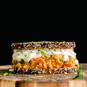 A creamy, spicy gochujang chickpea salad sandwich with spicy-sweet gochujang caramelized onions is a Korean-style twist on this lunchtime favorite! It’s hearty, satisfying, and packed with FLAVOR! Options for gluten-free Soyfree and nutfree.