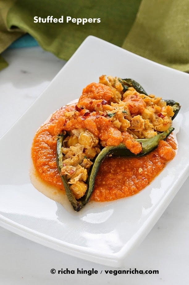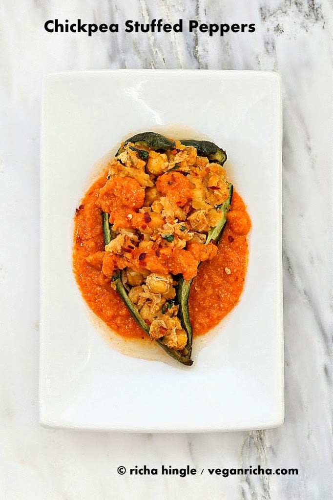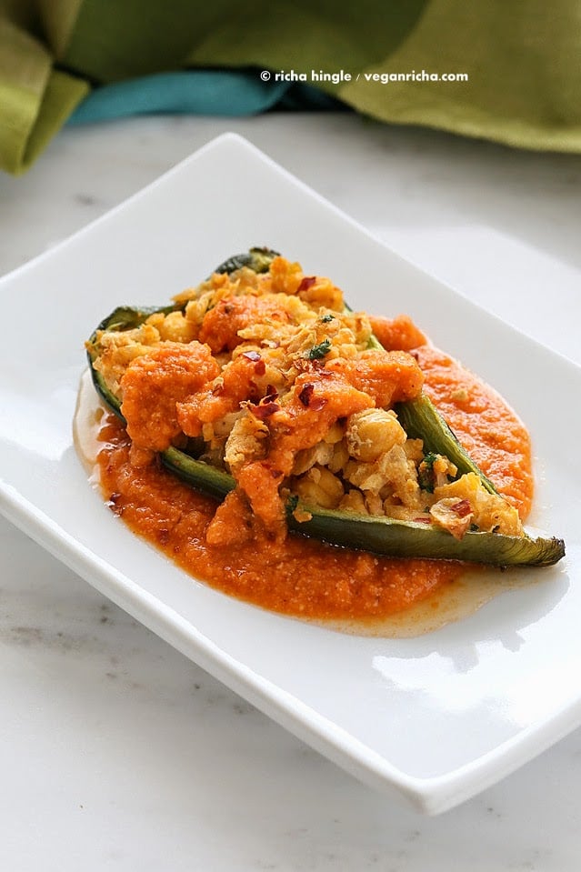 Chickpea Stuffed Poblano Peppers with Smoky Tomato Sauce. Easy 30 minute meal. Indian fusion recipe. Vegan Gluten-free Soy-free