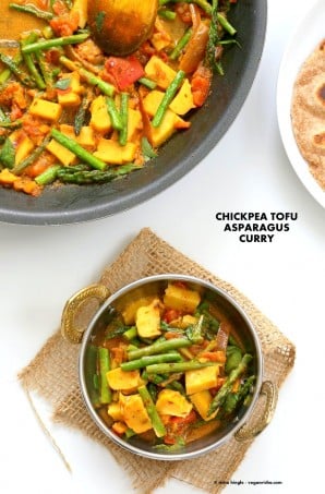 This super simple curry has Chickpea flour Tofu, Asparagus and cumin spiced onion tomato sauce. The asparagus is lightly toasted with garlic. then the sauce is made with onion, ginger, garlic, cumin and tomatoes. Add some non dairy milk or cream, asparagus and chickpea tofu, bring to a boil and done. For variation, use other spices or spice blends.