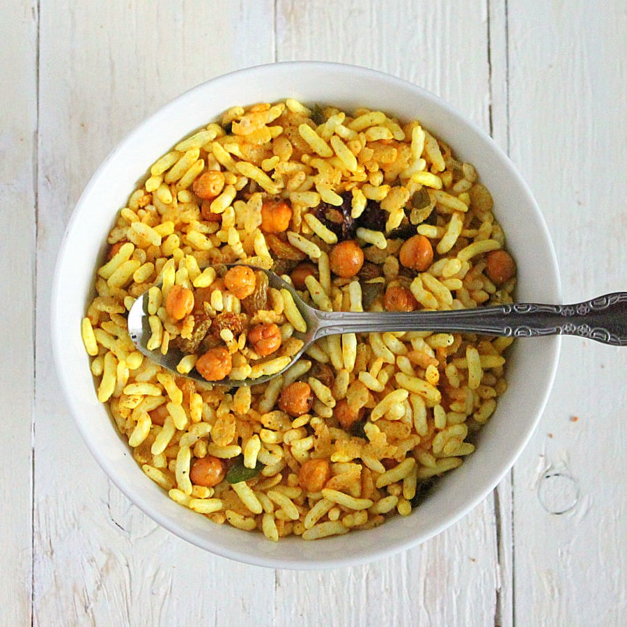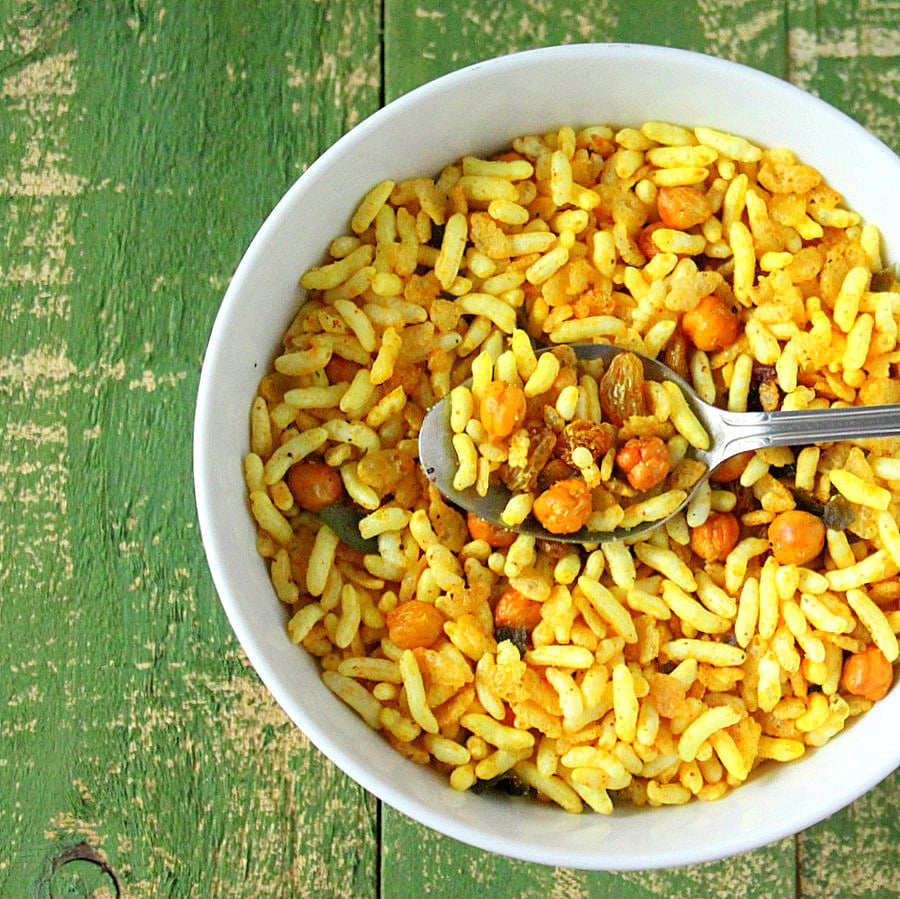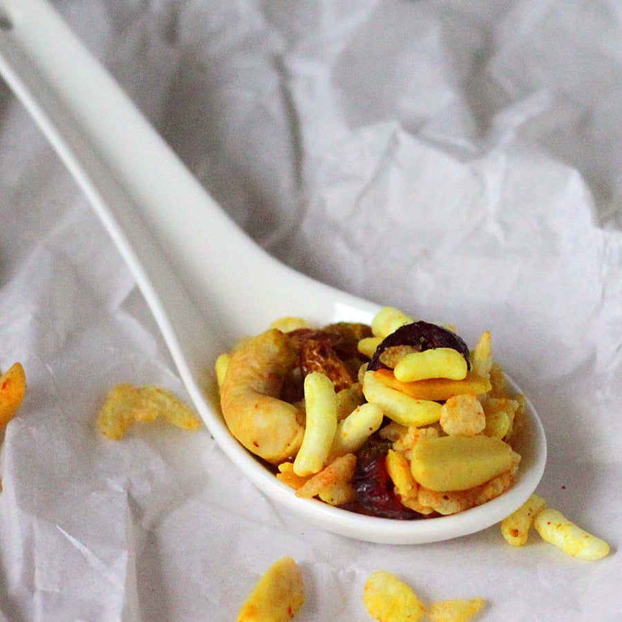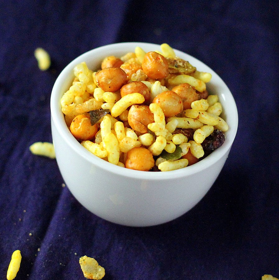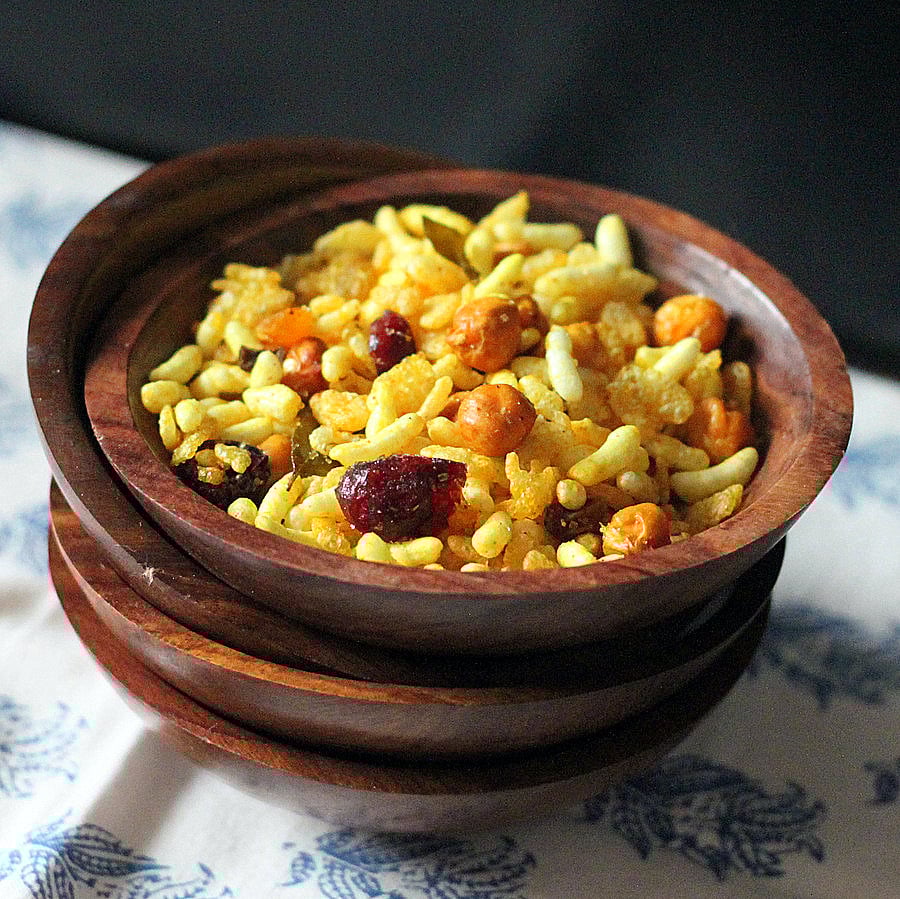 It is spiced with green or red chili, has nuts and dried fruits, sometimes has combinations of fried chickpea flour noodles(thin or thick Sev) or potato noodles(Aloo bhujia) and sometimes made sweet and salty. There are several varieties and names for the snack depending on the region in India. It is a fun option for a craving between meals to just munch on something. We Indians crave spice and salt more than sweet.:)